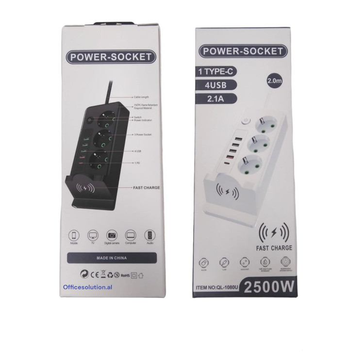 این محصول با کابل دو متری دارای چهار پورت خروجی USB و یک پورت خروجی TYPE C و سه پریز است و همچنین قابلیت شارژ وایرلس با قدرت 15W را داراست.